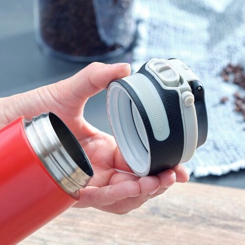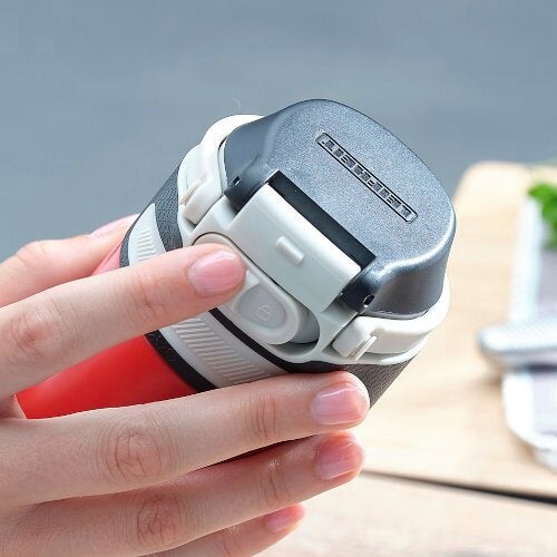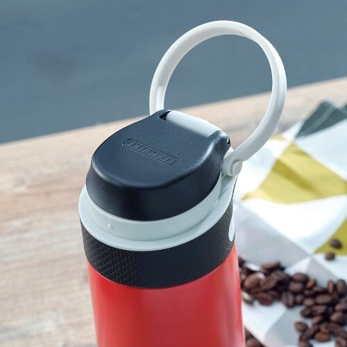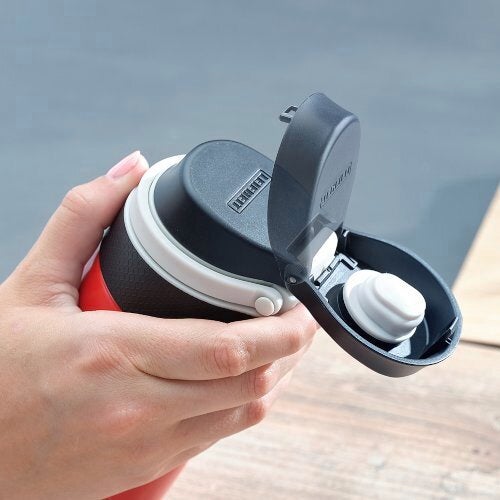 Un accessoire pratique pour tous ceux qui ne peuvent pas se passer de café ou de thé même en déplacement : le mug isotherme 350 ml de Leifheit. Il est 100 % étanche et donc garanti anti-fuite. Il présente également une ouverture facile à une main sans avoir à le poser. Le bouton poussoir pour ouvrir le couvercle est facile à actionner avec l’index. Un verrouillage supplémentaire du couvercle prévient les ouvertures accidentelles : on peut donc le transporter sans problème dans un sac. Le mug est également doté d’une surface anti-dérapante pour une meilleure tenue et une ouverture particulièrement facile. La poignée rabattable permet non seulement une tenue pratique du mug isotherme Flip 350 ml, mais aussi de le fixer à un sac à dos ou un sac à main. Le filtre amovible permet l'obtention d'une boisson sans résidu. La double-paroi en acier inoxydable du mug isotherme Flip maintient les boissons jusqu’à six heures au chaud et jusqu’à 18 heures au frais. De par sa taille compacte et sa contenance de 350 ml, il est parfaitement adapté pour une utilisation quotidienne et passe sans problème dans la plupart des machines à café. Bien évidemment, ce mug ne contient ni BPA ni aucune autre substance nocive et ne présente donc aucun danger pour la santé. Avec son design en inox allié au rouge classique, le mug isotherme ne passera pas inaperçu. Il est également disponible en noir, argent, bleu foncé, kiwi, violet et bleu clair.- Manipulation pratique à une main pour une ouverture facile et agréable sans devoir poser le mug.