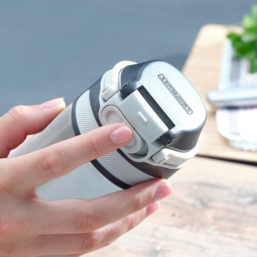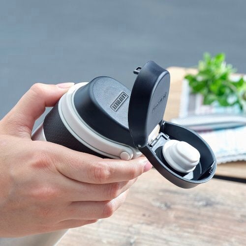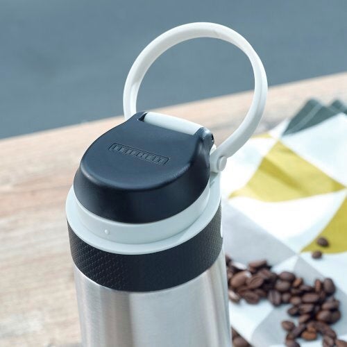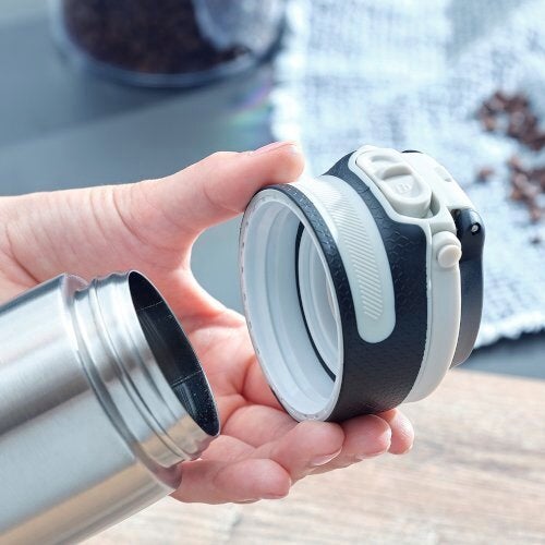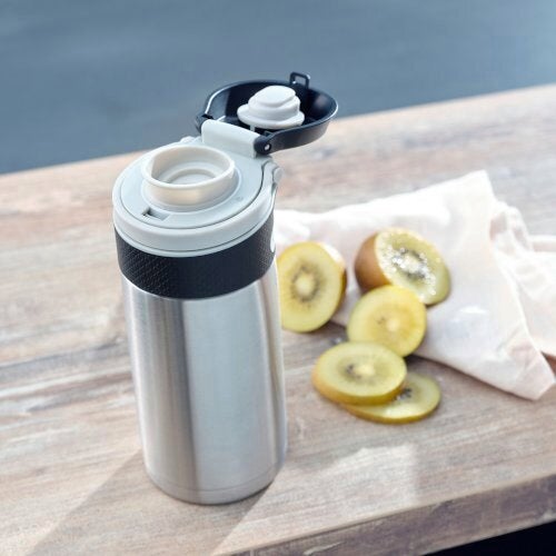 Un accessoire pratique pour tous ceux qui ne peuvent pas se passer de café ou de thé même en déplacement : le mug isotherme 350 ml de Leifheit. Il est 100 % étanche et donc garanti anti-fuite. Il présente également une ouverture facile à une main sans avoir à le poser. Le bouton poussoir pour ouvrir le couvercle est facile à actionner avec l’index. Un verrouillage supplémentaire du couvercle prévient les ouvertures accidentelles : on peut donc le transporter sans problème dans un sac. Le mug est également doté d’une surface anti-dérapante pour une meilleure tenue et une ouverture particulièrement facile. La poignée rabattable permet non seulement une tenue pratique du mug isotherme Flip 350 ml, mais aussi de le fixer à un sac à dos ou un sac à main. Le filtre amovible permet l'obtention d'une boisson sans résidu. La double-paroi en acier inoxydable du mug isotherme Flip maintient les boissons jusqu’à six heures au chaud et jusqu’à 18 heures au frais. De par sa taille compacte et sa contenance de 350 ml, il est parfaitement adapté pour une utilisation quotidienne et passe sans problème dans la plupart des machines à café. Bien évidemment, ce mug ne contient ni BPA ni aucune autre substance nocive et ne présente donc aucun danger pour la santé. Avec son design en inox allié au silver classique, le mug isotherme ne passera pas inaperçu. Il est également disponible en noir, bleu foncé, rouge, kiwi, violet et bleu clair.- Manipulation pratique à une main pour une ouverture facile et agréable sans devoir poser le mug.