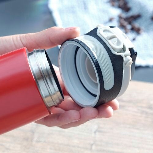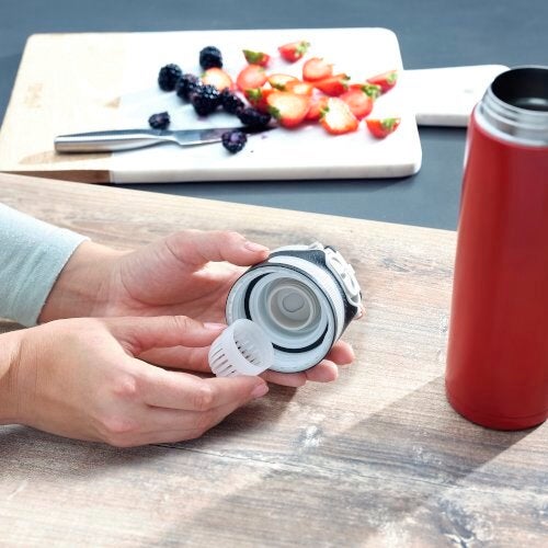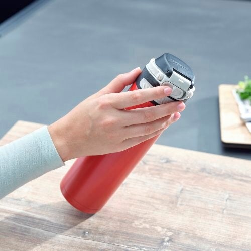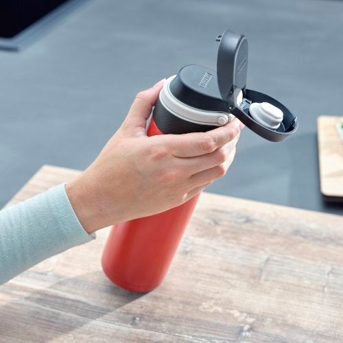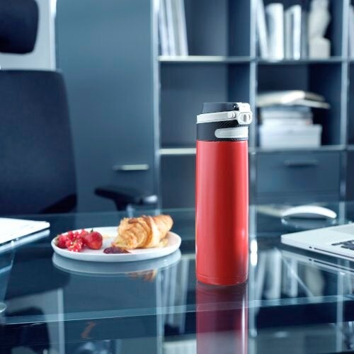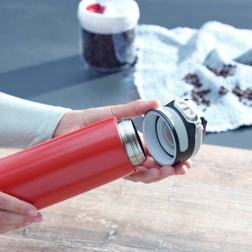 Un accessoire pratique pour tous ceux qui ne peuvent pas se passer de café ou de thé même en déplacement : le mug isotherme 600 ml de Leifheit. Il est 100 % étanche et donc garanti anti-fuite. Il présente également une ouverture facile à une main sans avoir à le poser. Le bouton poussoir pour ouvrir le couvercle est facile à actionner avec l’index. Un verrouillage supplémentaire du couvercle prévient les ouvertures accidentelles : on peut donc le transporter sans problème dans un sac. Le mug est également doté d’une surface anti-dérapante pour une meilleure tenue et une ouverture particulièrement facile. La poignée rabattable permet non seulement une tenue pratique du mug isotherme Flip 600 ml, mais aussi de le fixer à un sac à dos ou un sac à main. Le filtre amovible permet l'obtention d'une boisson sans résidu. La double-paroi en acier inoxydable du mug isotherme Flip maintient les boissons jusqu’à six heures au chaud et jusqu’à 18 heures au frais. Avec sa contenance de 600 ml, il est parfaitement adapté pour une utilisation quotidienne, que ce soit au bureau, à la fac ou à l’école. Bien évidemment, ce mug ne contient ni BPA ni aucune autre substance nocive et ne présente donc aucun danger pour la santé. Avec son design en inox allié au red classique, le mug isotherme ne passera pas inaperçu. Il est également disponible en black, silver, dark blue, kiwi, purple et light blue.- Manipulation pratique à une main pour une ouverture facile et agréable sans devoir poser le mug.
