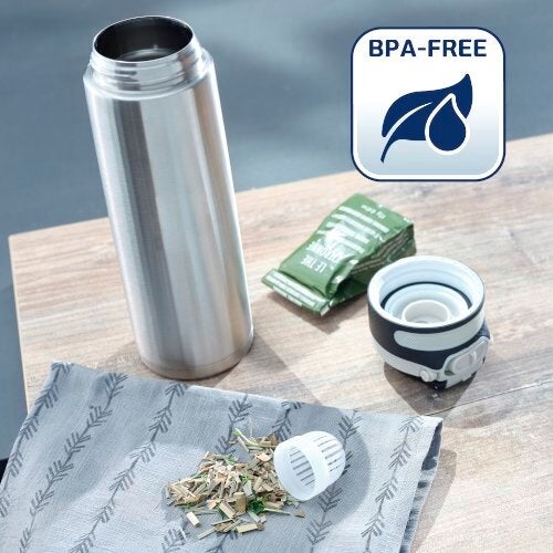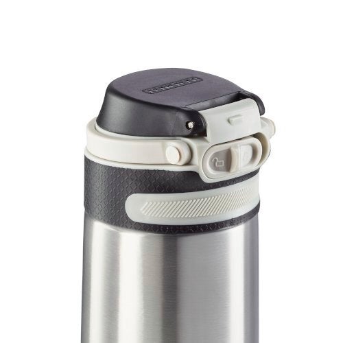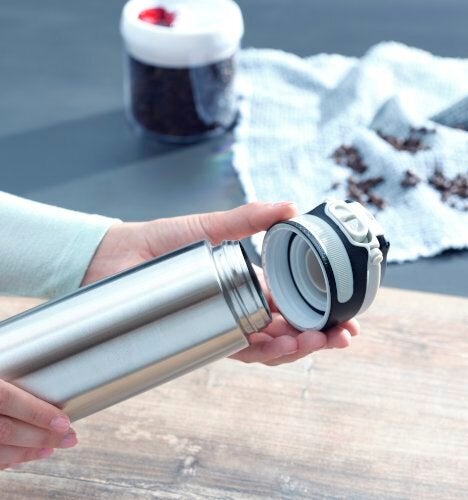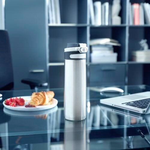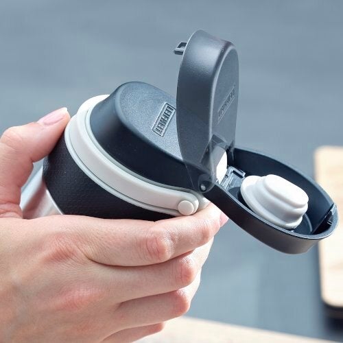 Un accessoire pratique pour tous ceux qui ne peuvent pas se passer de café ou de thé même en déplacement : le mug isotherme 600 ml de Leifheit. Il est 100 % étanche et donc garanti anti-fuite. Il présente également une ouverture facile à une main sans avoir à le poser. Le bouton poussoir pour ouvrir le couvercle est facile à actionner avec l’index. Un verrouillage supplémentaire du couvercle prévient les ouvertures accidentelles : on peut donc le transporter sans problème dans un sac. Le mug est également doté d’une surface anti-dérapante pour une meilleure tenue et une ouverture particulièrement facile. La poignée rabattable permet non seulement une tenue pratique du mug isotherme Flip 600 ml, mais aussi de le fixer à un sac à dos ou un sac à main. Le filtre amovible permet l'obtention d'une boisson sans résidu. La double-paroi en acier inoxydable du mug isotherme Flip maintient les boissons jusqu’à six heures au chaud et jusqu’à 18 heures au frais. Avec sa contenance de 600 ml, il est parfaitement adapté pour une utilisation quotidienne, que ce soit au bureau, à la fac ou à l’école. Bien évidemment, ce mug ne contient ni BPA ni aucune autre substance nocive et ne présente donc aucun danger pour la santé. Avec son design en inox allié au silver classique, le mug isotherme ne passera pas inaperçu. Il est également disponible en black, dark blue, red, kiwi, purple et light blue.- Manipulation pratique à une main pour une ouverture facile et agréable sans devoir poser le mug.