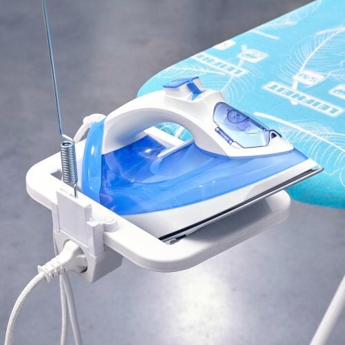 - le fer à repasser est posé en toute sécurité grâce au repose-fer fixe avec prise électrique et guide-fil